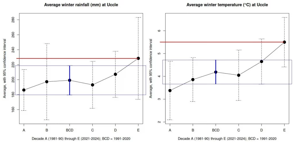 In a nutshell: the tradition is to use a 30-year average of weather variables (e.g. rainfall, temperature) during the recent past and consider this to be the “normal”. My point is that, during a period when weather consistently changes fast from year to year, the average is meaningless if weather displays a trend, as with the current warming period2. Since not all weather variables are affected in the same way by the ongoing changes, this post applies to different degrees to different weather variables3, as will indeed be illustrated below for rainfall and temperature using data from Uccle, Belgium.