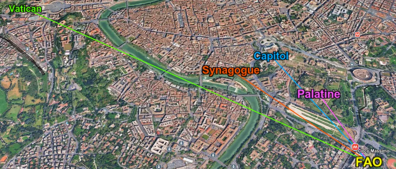 Quelques jours plus tard, une collègue franco-israélienne vient me trouver pour suggérer qu’il était inapproprié, pour une organisation des Nations Unies, de montrer une structure religieuse. J’avais vu la chose sous un angle touristique plutôt que religieux… mais7 je décide de modifier la vue en centrant la webcam sur le Palatin (en évitant soigneusement la Synagogue mais en incluant le Capitole; voir ici pour une carte) même si la vue incluait forcément l’une ou l’autre église (il y en a environ 900 à Rome). Nous avons aussi changé le nom de la webcam qui est devenue PALATINECAM.